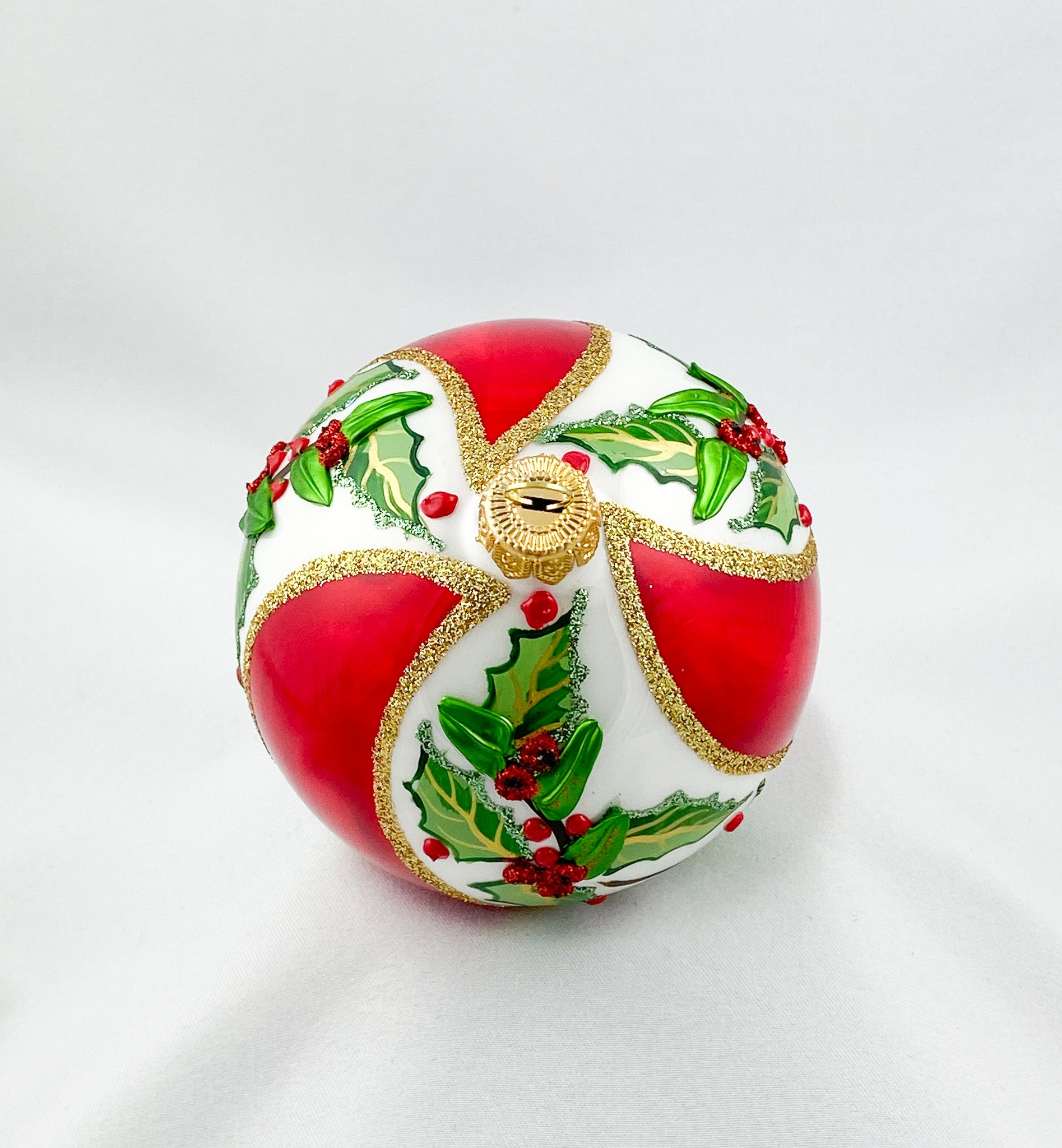 White red diagonally striped ball with holly decoration