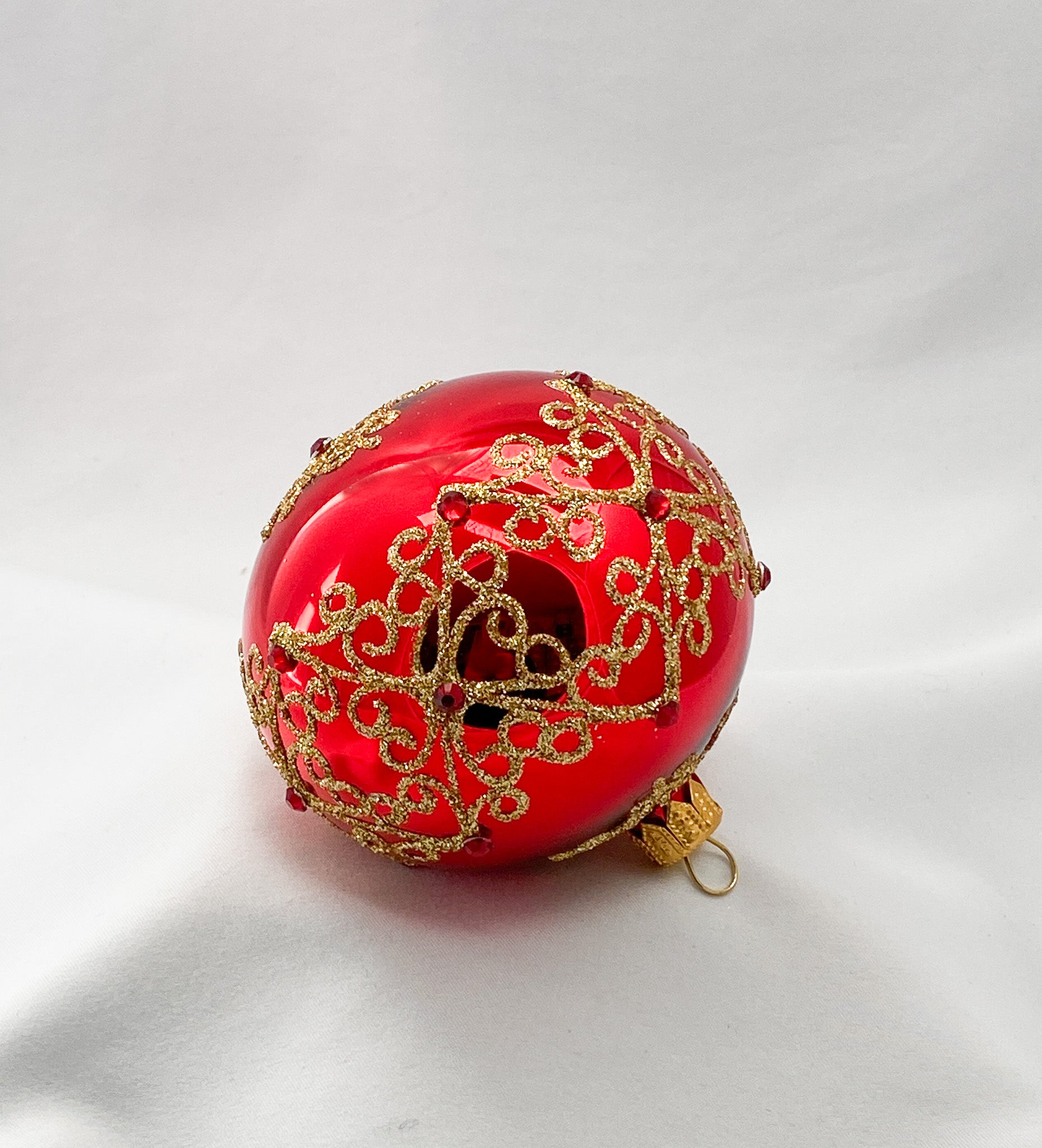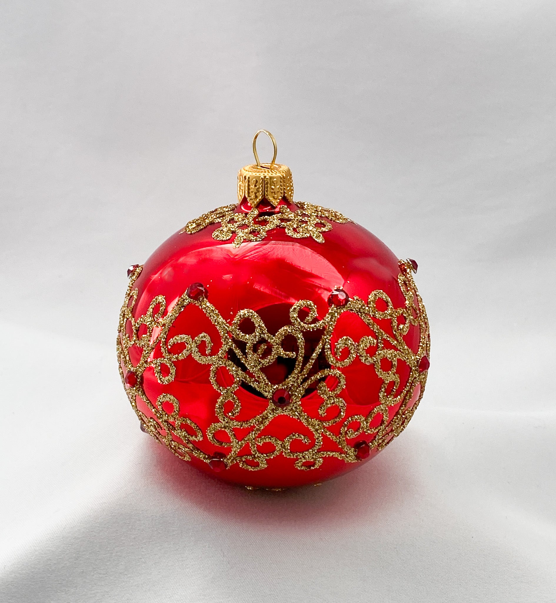 Kugel rot glanz mit goldenem Dekor und roten Schmucksteinen