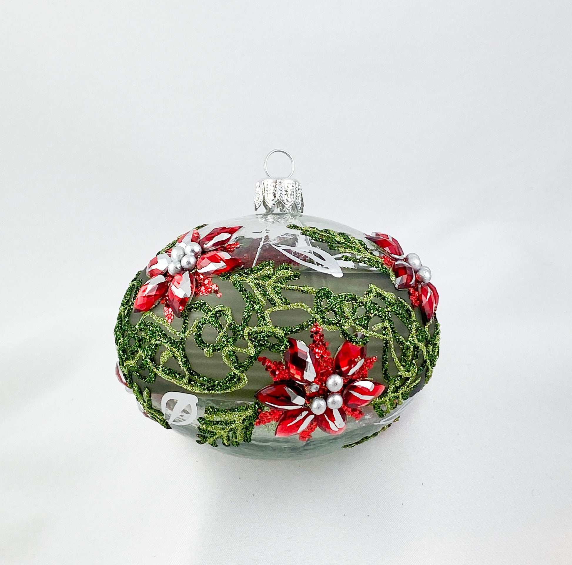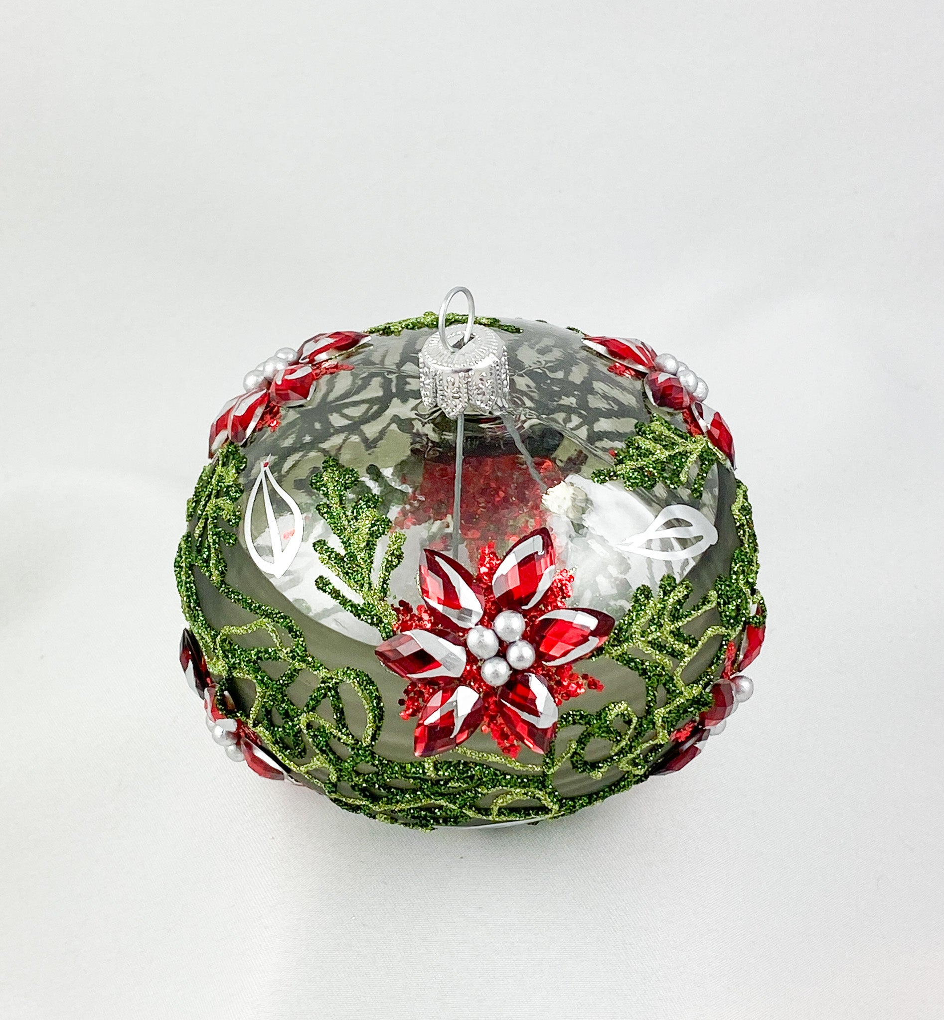 Transparente Kugel mit Blätterdekor und roten Blüten